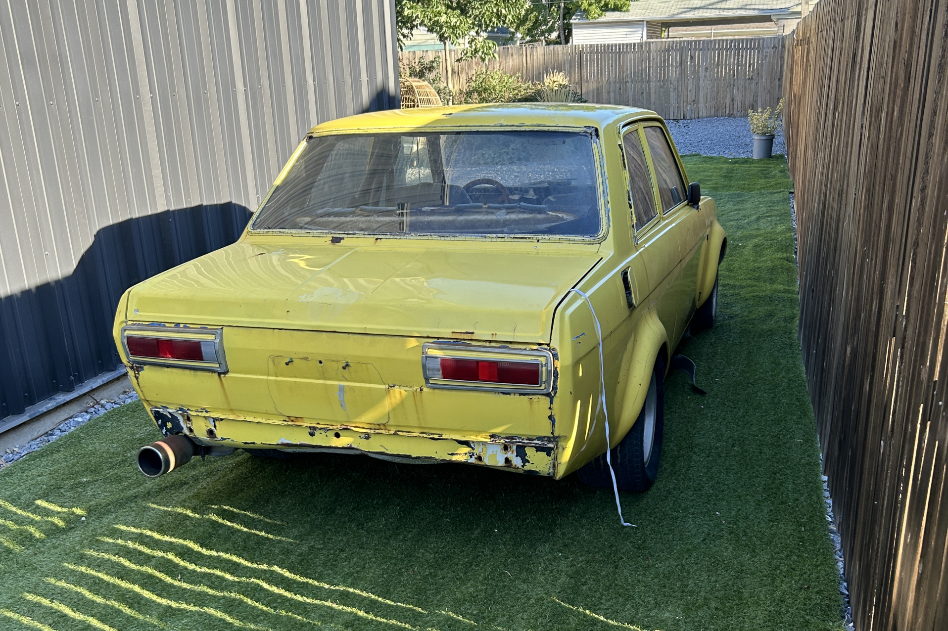 Yellow Datsun 510 in a driveway